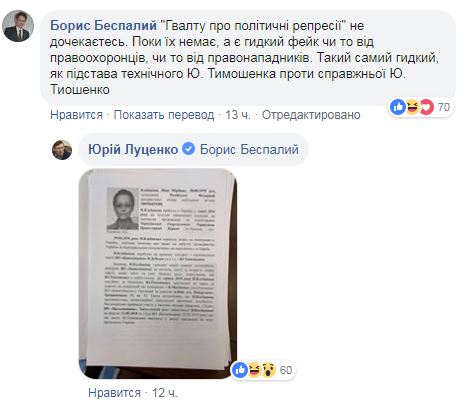 Фото было опубликовано в комментариях под постом Луценко о задержании по делу "о подкупе" кандидата Юрия Тимошенко в Facebook.