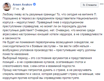 "Любому гневу есть разумные границы! То, что сегодня на митинге Порошенко в Черкассах предприняли представители Национального корпуса – недопустимо! Праведный гнев о коррупционном преступлении справедлив, но может ли он порождать другие преступные действия? Очевидно, нет. Очевидно, что многие среди агрессивно настроенных юношей хотели хардкора, а не справедливости и законности.