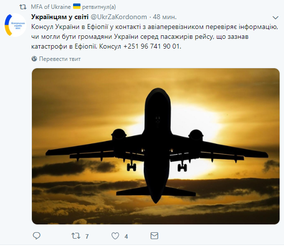 "Консул Украины в Эфиопии в контакте с авиаперевозчиком проверяет информацию о том, могли ли украинцы находится среди пассажиров рейса, который потерпел крушение", - говорится в сообщении МИД Украины в Twitter.
