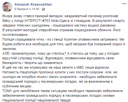 В то же время мы получаем на наши запросы из МВД только отписки. Зато Нацполиция предлагает купить у них услуги охраны. Но не нужно ничего и никого охранять - необходимо обеспечить общественный порядок в пассажирских поездах, которые по определению является публичным местом. Поэтому для предотвращения таких ситуаций необходимо срочно обеспечить охрану общественного порядка в пассажирских поездах силами Национальной полиции / национальной гвардии", - написал Александр Красноштан.