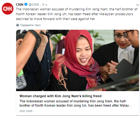 В Малайзии отпущена на свободу гражданка Индонезии, обвиняемая в убийстве сводного брата северокорейского лидера Ким Чен Ына. Об этом сообщает CNN в своем Twitter.