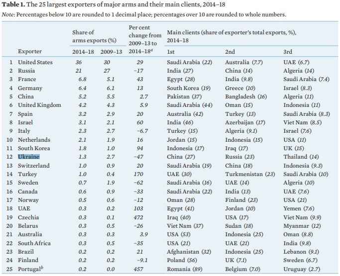 По информации SIPRI, с 2009 по 2014 годы доля украинского экспорта на мировом рынке составляла 2,7%, но с 2014-го по 2018-й она сократилась до 1,3%. Таким образом, Украина заняла 12 место в рейтинге крупнейших экспортеров оружия по версии SIPRI, поднявшись на одну позицию (в прошлогоднем рейтинге Украина занимала 11 место).