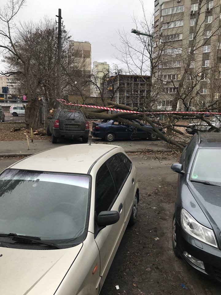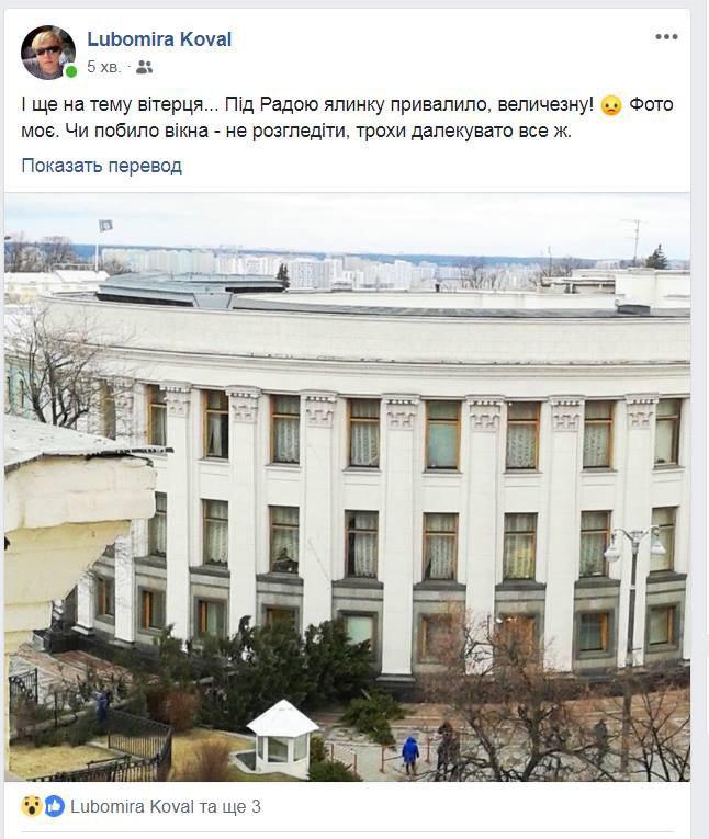 Позже выяснилось, что хвойное дерево упало возле первого подъезда, через который на работу заезжает спикер Рады Андрей Парубий.