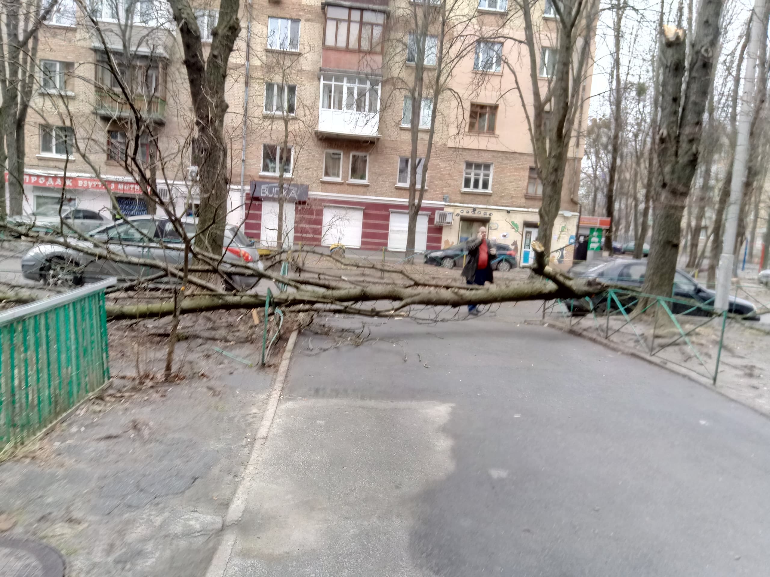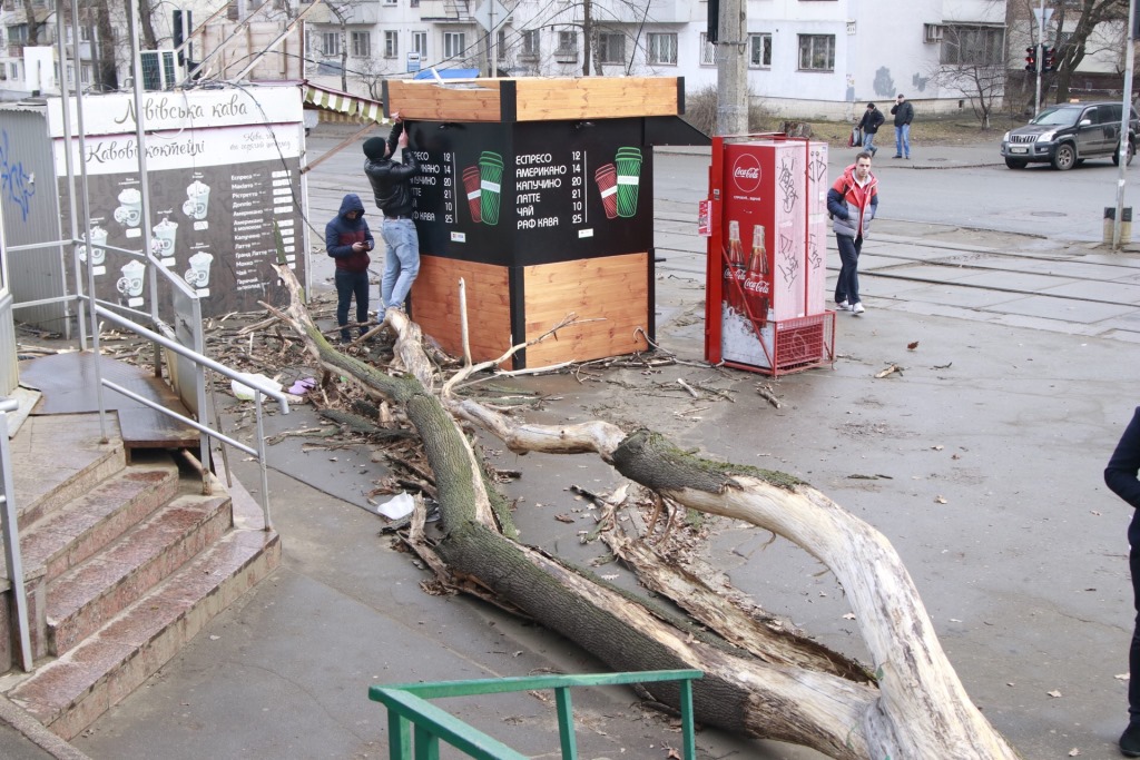 На улице Ольжича дерево упало перед подъездом. Обошлось без пострадавших.