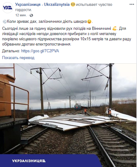 В Винницкой области на час было приостановлено железнодорожное сообщение, пока железнодорожники убирали с рельсов сорванную кровлю 10*15 м и восстанавливали оборванные провода.