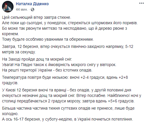 Но этот сильный ветер стихнет уже завтра, написала в Facebook синоптик Наталка Диденко. "Завтра, 12 марта, ветер ожидается северо-западного направления, 5-12 метров в секунду", - говорит она.