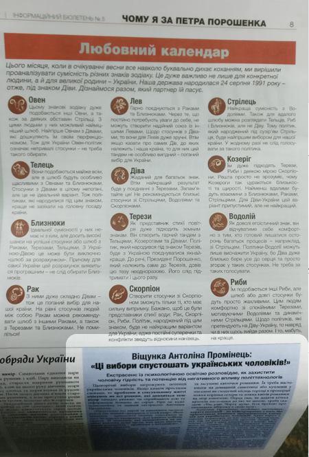 "В агитационной газете президента Петра Порошенко есть статья, в которой экстрасенс рассказывает, как защитить мужское достоинство и потенцию от негативного влияния политтехнологов", - написал он. Из скриншта следует, что вещунка Антолина Проминец считает, что "эти выборы опустошат украинских мужчин". Также на этой странице размещен "Любовный календарь".