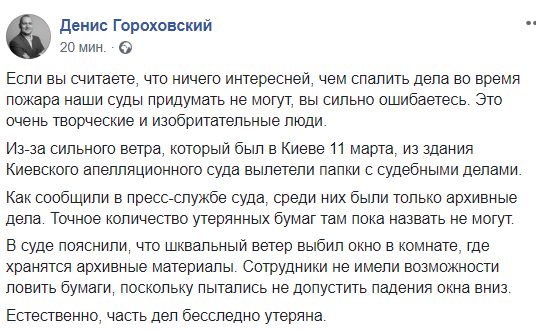 "В суде пояснили, что шквальный ветер выбил окно в комнате, где хранятся архивные материалы. Сотрудники не имели возможности ловить бумаги, поскольку пытались не допустить падения окна вниз. Естественно, часть дел бесследно утеряна", - написал Гороховский.