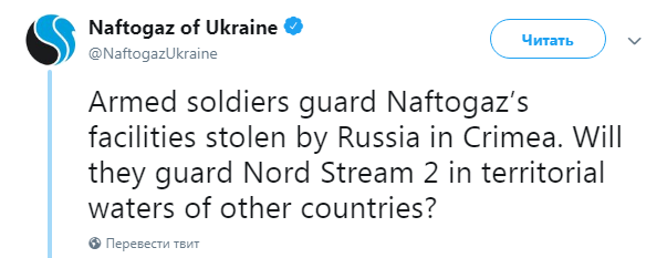 "Вооруженные солдаты охраняют объекты "Нафтогаза", похищенные Россией в Крыму. Будут ли они охранять "Северный поток-2" в территориальных водах других стран?", - спрашивают в компании.