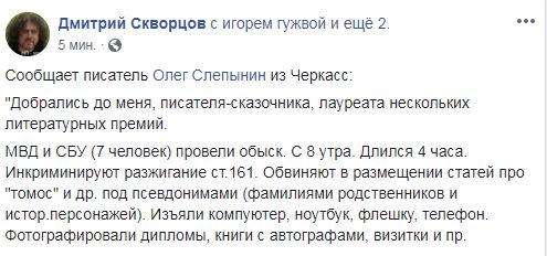 "Добрались до меня, писателя-сказочника, лауреата нескольких литературных премий", - приводит Скворцов слова Слепынина. "МВД и СБУ (7 человек) провели обыск. С 8 утра. Длился 4 часа. Инкриминируют разжигание ст.161 (Нарушение равноправия граждан в зависимости от их расовой, национальной принадлежности, религиозных убеждений, инвалидности и по другим признакам - прим. ред.). Обвиняют в размещении статей про "томос" и др. под псевдонимами (фамилиями родственников и истор.персонажей). Изъяли компьютер, ноутбук, флешку, телефон. Фотографировали дипломы, книги с автографами, визитки и пр.", - пишет Скворцов.