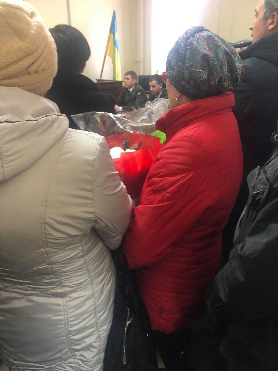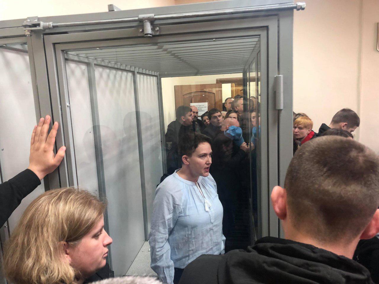 В зале заседаний собралось много людей, пожилая женщина принесла с собой букет из конфет. На столе перед прокурорами и адвокатами лежит медаль Героя Украины, принадлежащая Савченко. Ее адвокат Александр Шадрин подал ходатайство об отводе судей. По его словам, был изменен номер дела, чего быть не может: это вызывает подозрения в предвзятости суда.