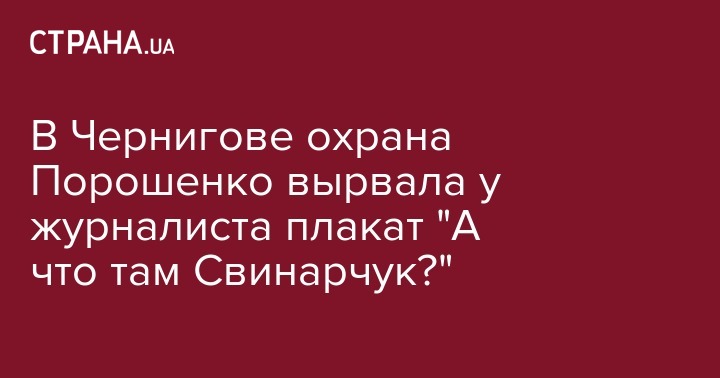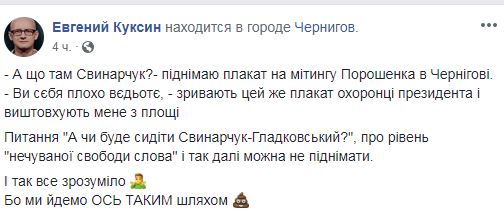 Журналист Евгений Куксин на митинге Петра Порошенко в Чернигове 14 марта поднял плакат с надписью "А что там Свинарчук?", после чего к нему подошли охранники президента и вырвали плакат. Об этом Куксин написал на своей странице в Facebook.
