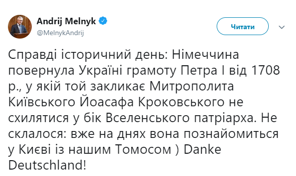 Посол Украины в Германии Андрей Мельник получил от статс-секретаря МИД ФРГ Вальтера Линднера грамоту царя Российской Империи Петра I о назначении Киевского митрополита, датированную 1708 годом. Церемония передачи состоялась в немецком МИД в Берлине, передает ТАСС.