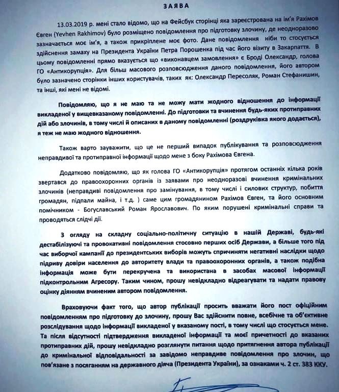 "Прошу считать мой пост, как официальное сообщением о готовящемся преступлении. Во время визита Порошенко в Закарпатье на него намерены совершить покушение", - написал он.
