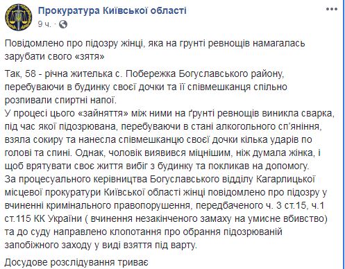 В селе Киевской области во время распития спиртных напитков теща пыталась зарубить своего зятя топором. Об этом 15 марта пишет пресс-служба прокуратуры Киевской области в Facebook.
