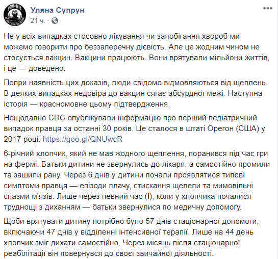 "Несмотря на то, что пришлось пережить их ребенку, они остались противниками вакцин", - резюмирует Супрун.