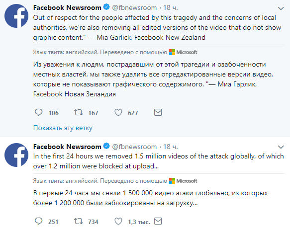 Официальный представитель Facebook Мия Гарлик также добавила, что в соцсети будут работать круглосуточно, чтобы удалить подобный контент. Также в Facebook выразили соболезнования родственникам и близким погибших в Новой Зеландии.