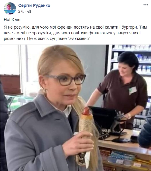 Пост политик сопроводила хештегом #ХотдогНаЗаправці. В комментариях пользователи желали ей приятного аппетита, хотя некоторые успомнились, что Юлия Владимировна на самом деле его съела – на видео этого нет.