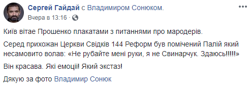 Напомним, что Александр Палий буквально на днях посетил митинг президента Петра Порошенко в Киеве. В этот день журналисту "Страны" не дали задать вопрос гаранту. Зато Палия сфотографировали, агитирующим за действующую власть с поднятыми вверх руками.