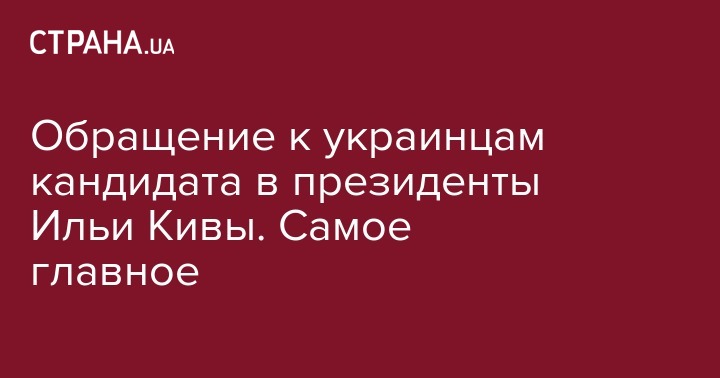 "Добрый вечер, Украина! Сегодня у меня есть возможность рассказать о себе. Да, я Илья Кива и сегодня кандидат в президенты. Есть бумага и заготовленные тексты. Но я постараюсь рассказать о себе, чтобы это было честно по отношению к вам. 41 год, три высших образования, юрист. В семье нашей формировалась позиция мужчин-защитников родины. Мой дед - герой Советского союза. Да, я воспитывался на его подвигах, а не Бандеры и Шухевича. И я в 2014 году ушел защищать, потому что это долг каждого мужчины. Не за Порошенко, не за Турчинова, а за свою землю. И воевал я достаточно хорошо, о чем свидетельствуют мои награды. Но пока мы ложили 20-летних пацанов в землю, эта банда, которая у власти, грабила народ, за который мы проливали кровь", - начал Кива.