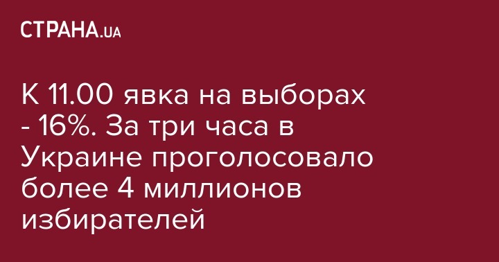 Отметим, что на момент начала голосования в реестре избирателей было зарегистрировано 26 млн 614 тысяч 979 человек. Таким образом, по состоянию на 11:00 в Украине проголосовало около 4 миллионов 279 тысяч 680 человек.