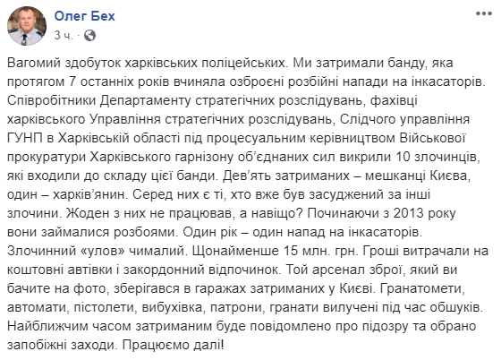 По его словам, ни один из задержанных нигде не работал. "Начиная с 2013 года они занимались разбоями. Один год - одно нападение на инкассаторов. Преступный "улов" немалый. По меньшей мере 15 млн грн. Деньги тратили на дорогие машины и зарубежный отдых", - написал Олег Бех.