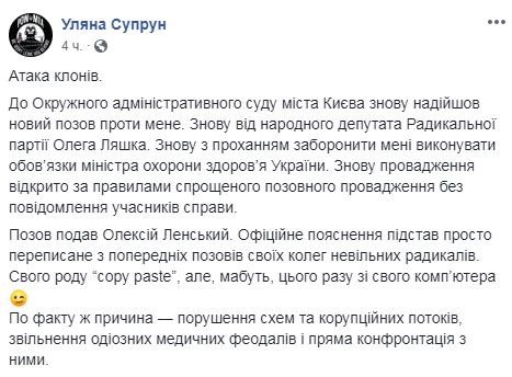 "В Окружной административный суд Киева снова поступил новый иск против меня. Опять от народного депутата Радикальной партии Олега Ляшко. Опять с просьбой запретить мне исполнять обязанности министра здравоохранения Украины. Опять производство открыто по правилам упрощенного искового производства без уведомления участников дела. Иск подал Алексей Ленский. Официальное объяснение оснований просто переписано из предыдущих исков его коллег-несвободных радикалов. Своего рода "copy paste", но, видимо, на этот раз со своего компьютера",- написала Супрун.