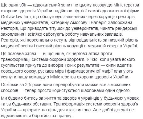 И.о. министра также отметила: "Адвокатский запрос по этому иску к Министерству здравоохранения Украины поступил от той же адвокатской фирмы GoLaw law firm, обслуживающей уволенных из-за коррупции ректоров медицинских университетов Екатерину Амосову и Валерия Запорожана".