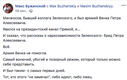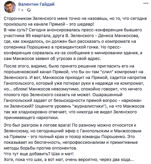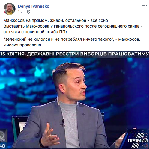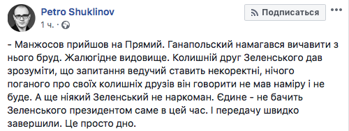 "Манжосов пришел на "Прямой". Ганапольский пытался выжать из него грязь. Жалкое зрелище. Бывший друг Зеленского дал понять, что вопросы ведущий задает некорректные, ничего плохого о своих бывших друзьях он говорить не собирался и не будет. А еще никакой Зеленский не наркоман. Единственное – не видит Зеленского президентом именно в это время.