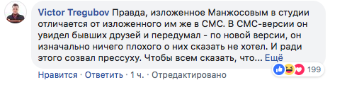 "Правда, изложенное Манжосовым в студии отличается от изложенного им же в СМС. В СМС-версии он увидел бывших друзей и передумал – по новой версии, он изначально ничего плохого о них сказать не хотел. И ради этого созвал прессуху. Чтобы всем сказать, что ничего плохого о Зеленском не скажет. Логично, чо.