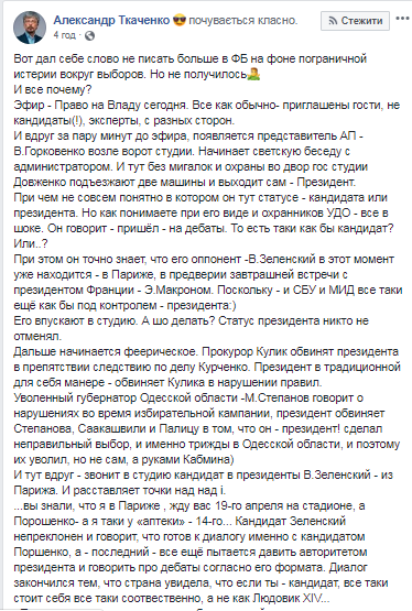 Дальше начинается феерическое. Прокурор Кулик обвинят президента в препятствии следствию по делу Курченко. Президент в традиционной для себя манере - обвиняет Кулика в нарушении правил. Уволенный губернатор Одесской области - Степанов говорит о нарушениях во время избирательной кампании, президент обвиняет Степанова, Саакашвили и Палицу в том, что он - президент - сделал неправильный выбор, и именно трижды в Одесской области, и поэтому их уволил, но не сам, а руками Кабмина. И тут вдруг звонит в студию в президенты Зеленский - из Парижа. И расставляет точки над над і", - написал Ткаченко.