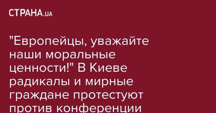 Участники акции держат в руках плакаты с надписями: "Европейцы, уважайте наши моральные ценности!", "Семья - это союз мужчины и женщины", "Мы против навязывания детям и молодежи аморальных ценностей!" Протестующих около двух десятков человек.