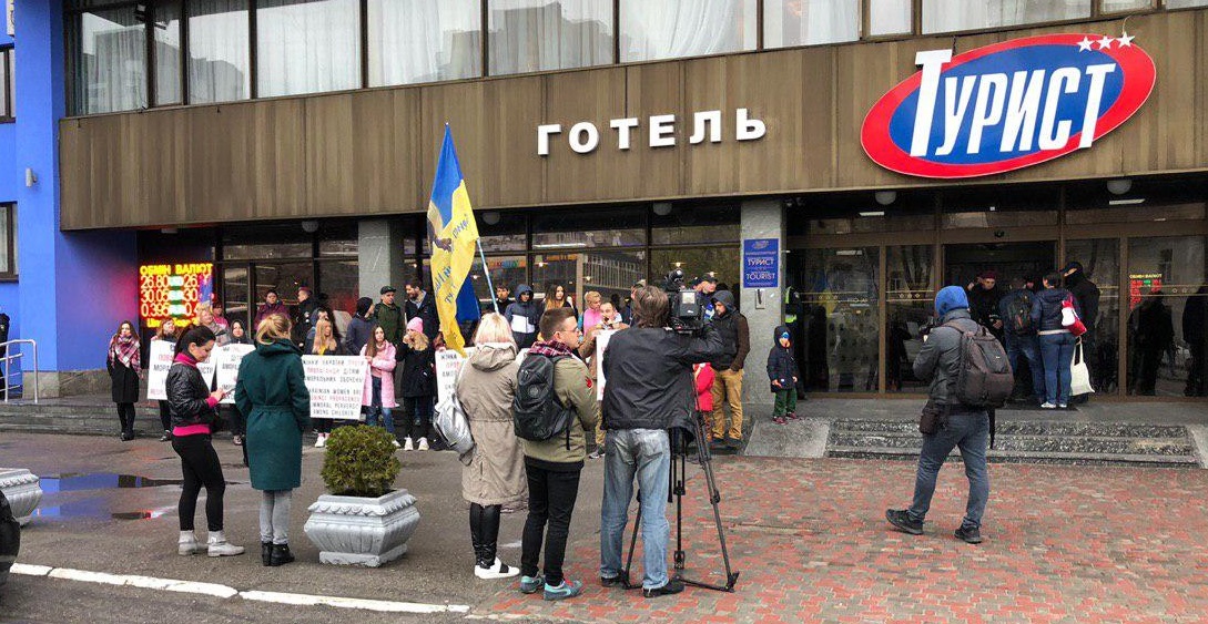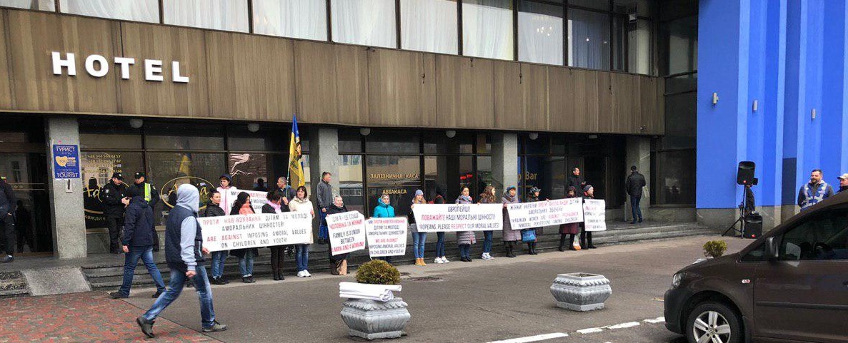 В Киеве у центрального входа в гостиницу "Турист" (возле метро "Левобережная") сегодня, 12 апреля, проходит акция протеста против инициатив Второй европейской лесбийской конференции. Об этом сообщает корреспондент "Страны".