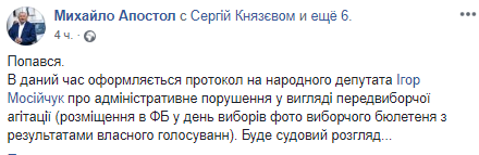 "Попался. В настоящее время оформляется протокол на народного депутата Игоря Мосийчука об административном нарушении в виде предвыборной агитации (размещение в ФБ в день выборов фото избирательного бюллетеня с результатами собственного голосования). Будет судебное разбирательство", - говорится в сообщении.