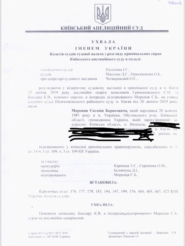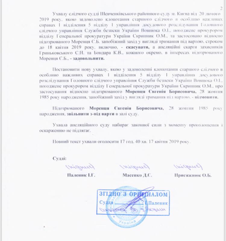 Тем самым апелляционная инстанция отменила ранее вынесенное 20 февраля решение Шевченковского райсуда Киева, по которому Моренец был помещен под стражу и содержался в т.н. СИЗО СБУ на Аскольдовом переулке. Судьи вынесли новую "ухвалу", где постановляется отказать в полном объеме в удовлетворении ходатайств прокуроров об избрании меры пресечения "Белой Балаклаве". Вслед за оглашением такого вердикта Евгений Моренец был освобожден в зале суда.