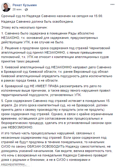 5. Срок содержания Савченко под стражей истекает в понедельник 15 апреля. До этого срока компетентный суд, но не Броварской, должен принять дело к своему производству и продлить (или не продлить) сроки содержания под стражей. Однако, в связи с крайне ограниченным временем, оставшимся для согласование всех процессуальных и бюрократических процедур, сделать это в установленный законом срок уже НЕВОЗМОЖНО.