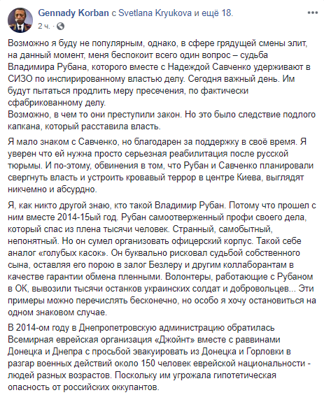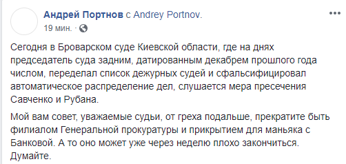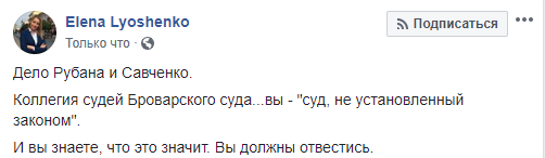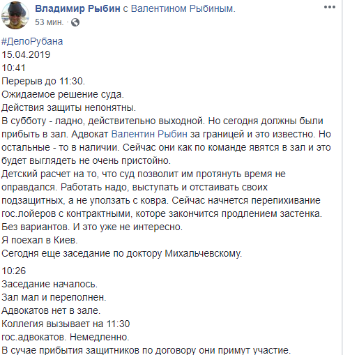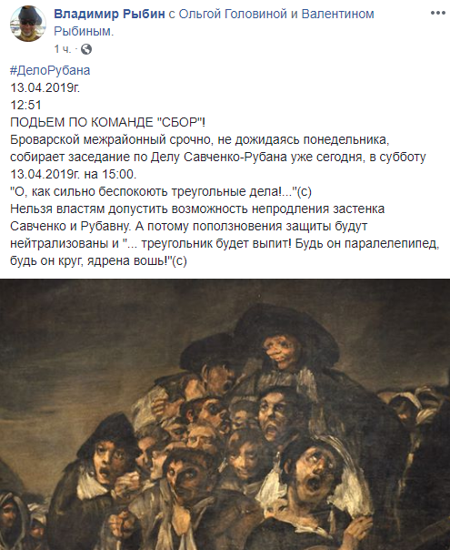 14:37 "Броварской межрайонный срочно, не дожидаясь понедельника, собирает заседание по Делу Савченко-Рубана уже сегодня, в субботу 13.04.2019 г. на 15:00. "О, как сильно беспокоють треугольные дела!..."(с) Нельзя властям допустить возможность непродления застенка Савченко и Рубавну. А потому поползновения защиты будут нейтрализованы и "... треугольник будет выпит! Будь он паралелепипед, будь он круг, ядрена вошь!"(с) - написал адвокат Владимира Рубана Владимир Рыбин.