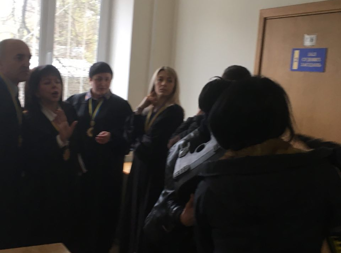 15:23 Сестра Савченко и Проторченко делают попытки занести в зал заседания колонку, из которой играет музыка. Полиция не даёт занести звуковую аппаратуру в зал заседания. Судьи вышли в коридор. Препирательства продолжаются.