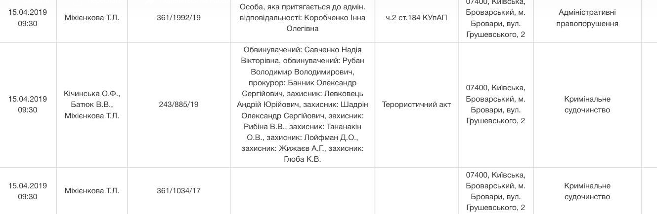 "13 апреля 2019 в Броварской горрайонный суд Киевской области с Киевского апелляционного суда по подсудности поступили материалы уголовного производства № 22018000000000237 по обвинению Савченко, Рубана Владимира Владимировича в совершении преступлений, предусмотренных ч. 1 ст. 109 ( "Действия, направленные на насильственное изменение или свержение конституционного строя или на захват государственной власти"), ч. 1 ст. 14 ч. 2 ст. 28 ч. 1 ст. 109 ("Действия, направленные на насильственное изменение или свержение конституционного строя или на захват государственной власти"), ч. 1 ст. 14 ч. 2 ст. 28, ст. 112 ( "Посягательство на жизнь государственного или общественного деятеля"), ч. 1 ст. 14