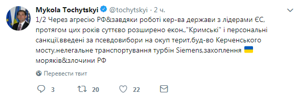 "Очередная попытка поиска горячей новости там, где ее нет. Никаких решений на днях о снятии санкций с бывших украинских чиновников ЕС не принимал и не готовится принимать. В Die Welt говорится о санкциях, которые были снятые в предыдущие годы", - написал Николай Точицкий.