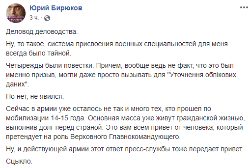 "Четырежды были повестки. Причем, вообще ведь не факт, что это был именно призыв, могли даже просто вызывать для "Уточнення облікових даних". Но нет, не явился. Сейчас в армии уже осталось не так и много тех, кто прошел по мобилизации 14-15 года. Основная масса уже живут гражданской жизнью, выполнив долг перед страной. Это вам всем привет от человека, который претендует на роль Верховного Главнокомандующего", - написал советник министра обороны Юрий Бирюков.
