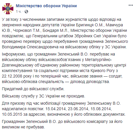 "Гражданин Зеленский В.А. находится на воинском учете военнообязанных в Металлургическо-Долгинцевском объединенном районном территориальном центре комплектования и социальной поддержки Кривого Рога с 22.12.2008 года и по настоящее время, воинское звание - солдат, военно-учетная специальность - делопроизводитель делопроизводства. Годен к военной службе. Военную службу в ВС Украины не проходил", - говорится в сообщении.
