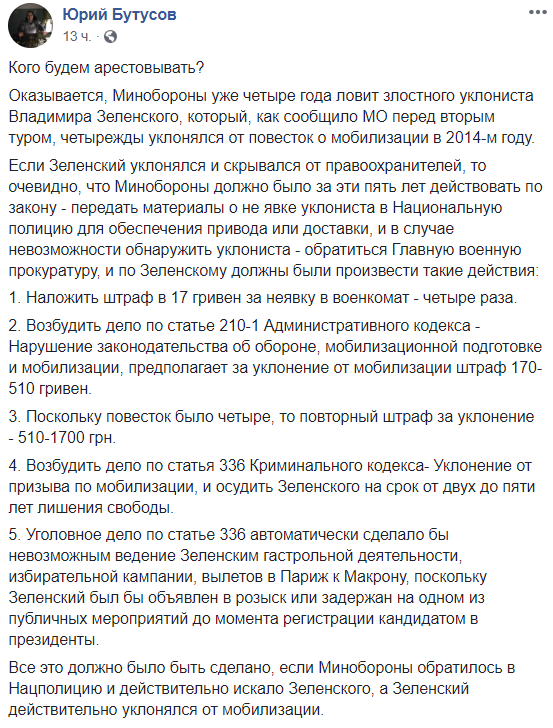 В то же время журналист Юрий Бутусов удивляется, почему, если Зеленский уклонист, его не преследовали по закону.