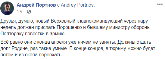 "Друзья, думаю, новый Верховный главнокомандующий через пару недель должен прислать Порошенко и бывшему министру обороны Полтораку повестки в армию.