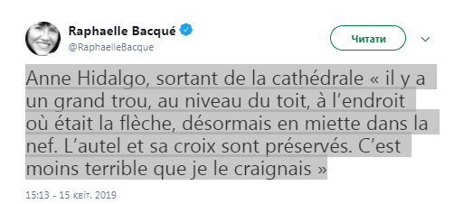 Кроме этого, удалось спасти сам Алтарь и алтарный крест. Об этом на месте ЧП заявила мэр Парижа Анн Идальго. Ее слова приводит репортер газеты Le Monde Рафаэль Баке в Twitter.