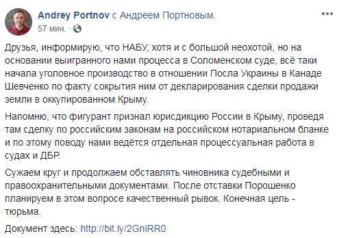 Национальное антикоррупционное бюро Украины (НАБУ) начало уголовное производство в отношении посла в Канаде Андрея Шевченко за продажу в Крыму принадлежавшей ему земли по российским законам. Об этом в Facebook сообщил юрист Андрей Портнов, по заявлению которого суд и обязал НАБУ начать расследование по этому факту.