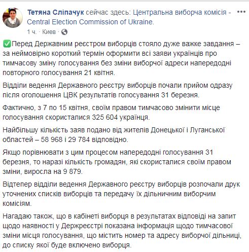 "Отделы ведения Государственного реестра избирателей начали прием (заявлений от украинцев о временном изменении места голосования - прим. ред.) сразу после объявления ЦИК результатов голосования 31 марта. Фактически, с 7 по 15 апреля, своим правом временно изменить место голосования воспользовались 325 тыс. 604 украинцев", - написала Слипачук.