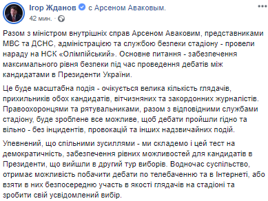 Министр молодежи и спорта Игорь Жданов и глава МВД Арсен Аваков с правоохранителями и сотрудниками ГосЧС, администрацией и службой безопасности стадиона - провели совещание на НСК "Олимпийский", где обсуждался вопрос максимального уровня безопасности при проведении дебатов между кандидатами в президенты Украины Владимиром Зеленским и Петром Порошенко. Об этом на своей странице в соцсети написал Жданов.