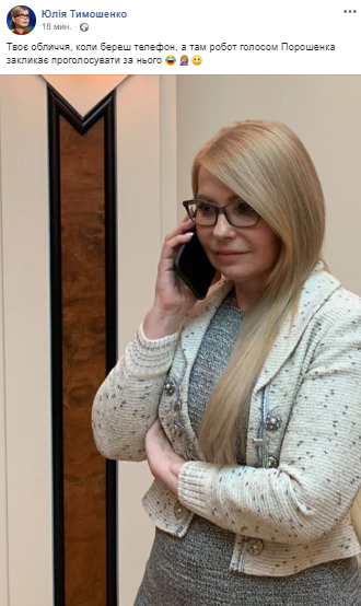 "Твое лицо, когда берешь телефон, а там робот голосом Порошенко призывает проголосовать за него", - написала в соцсети политик под фотографией, где она запечатлена во время прослушивания телефонного монолога Порошенко.