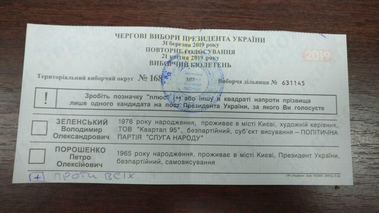 В бюллетене было две фамилии - действующего президента Петра Порошенко, который набрал 15,95% голосов в первом туре, и основателя "Квартала 95" шоумена Владимира Зеленского, которого 31 марта поддержали 30,24% проголосовавших.